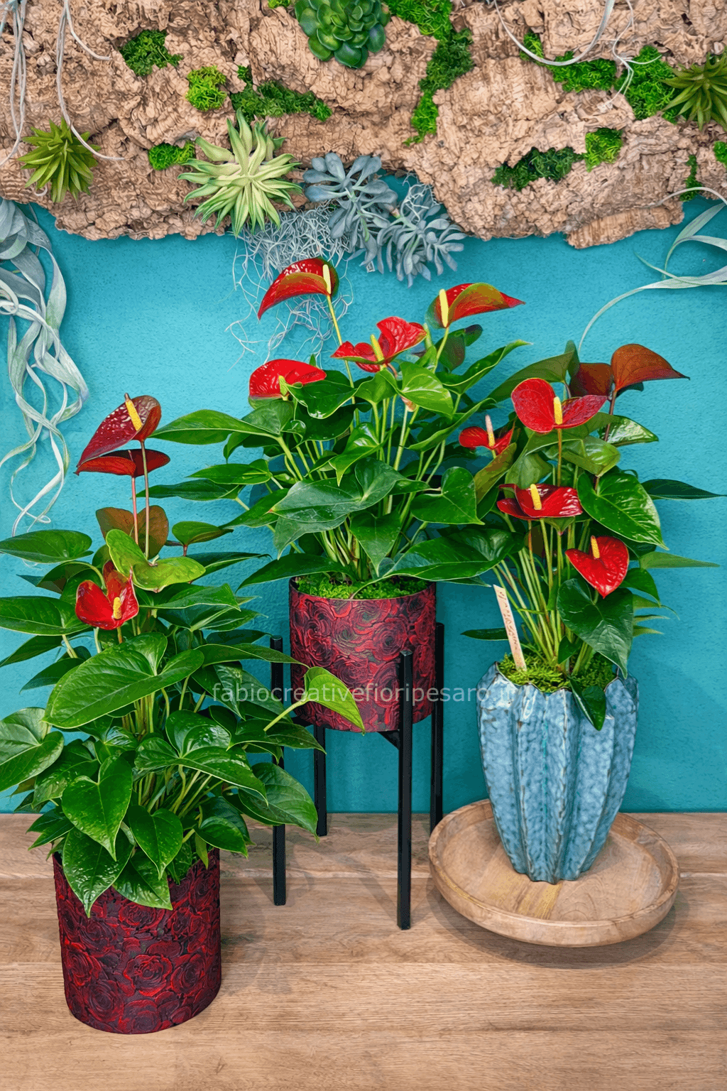 🌺 Le caratteristiche spate dai toni rosso intenso e bordeaux, abbinate agli spadici decorativi, donano un tocco di colore sofisticato e raffinato.