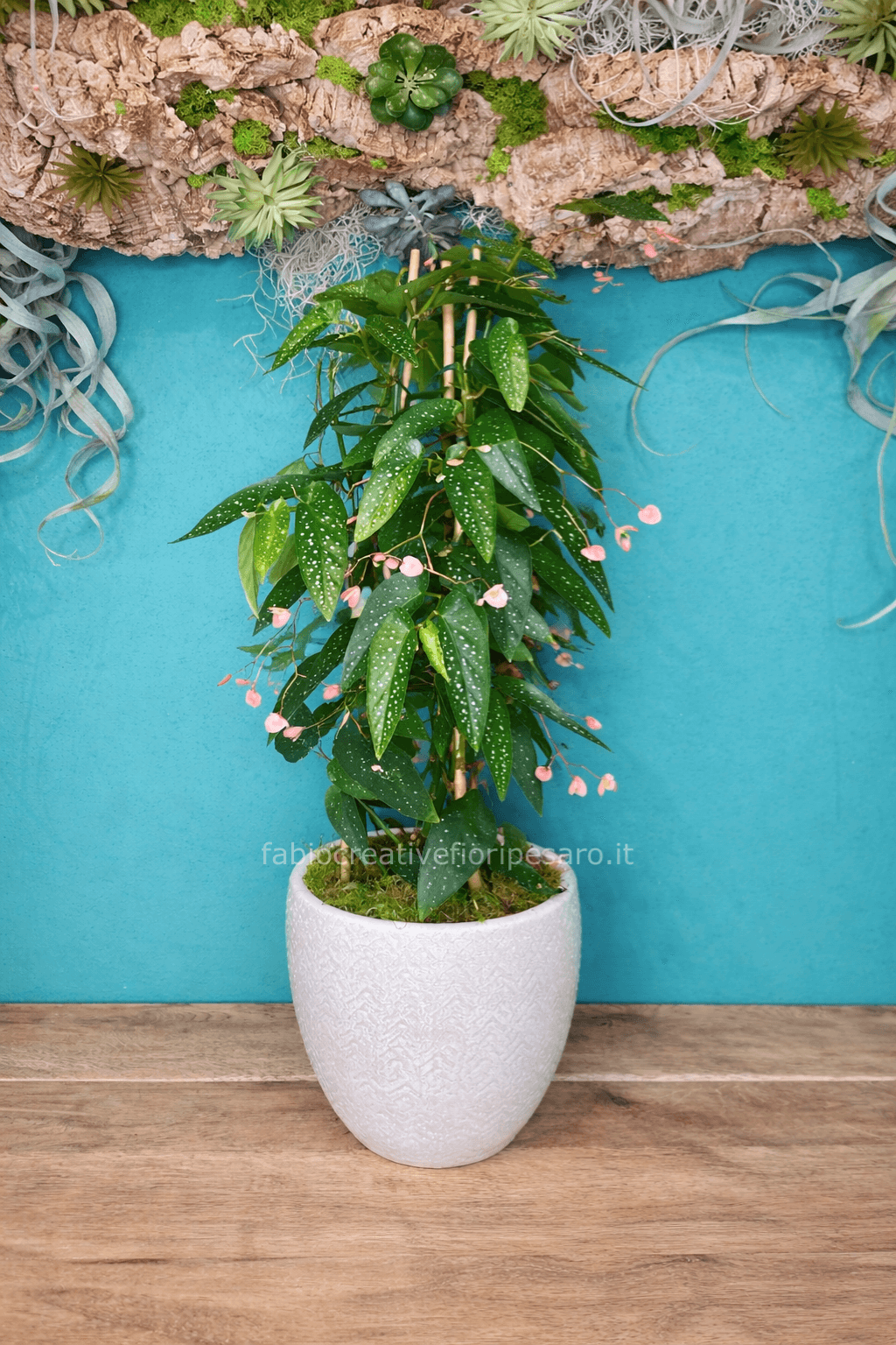 Questa splendida Begonia Maculata è una pianta d’appartamento molto amata per il suo fogliame scenografico e il suo portamento elegante, ideale per impreziosire ambienti moderni e luminosi.
