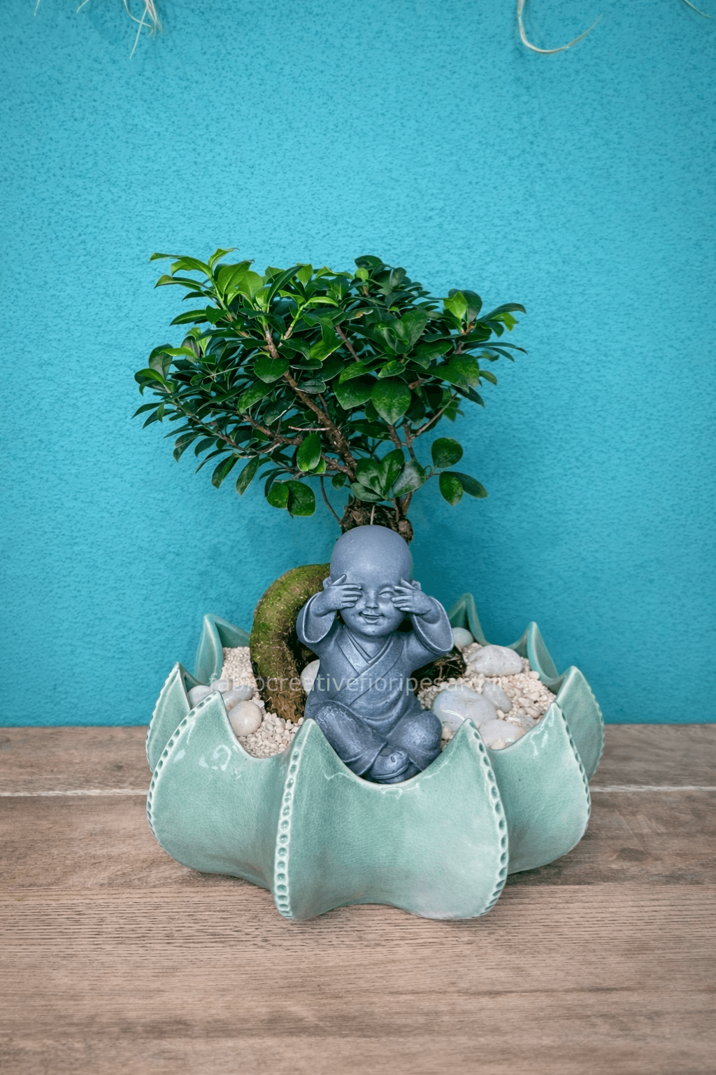 🧘♂️ Al centro della composizione, una scultura di monaco richiama i valori di calma, meditazione e armonia interiore, trasformando la pianta in un vero elemento di benessere visivo.
