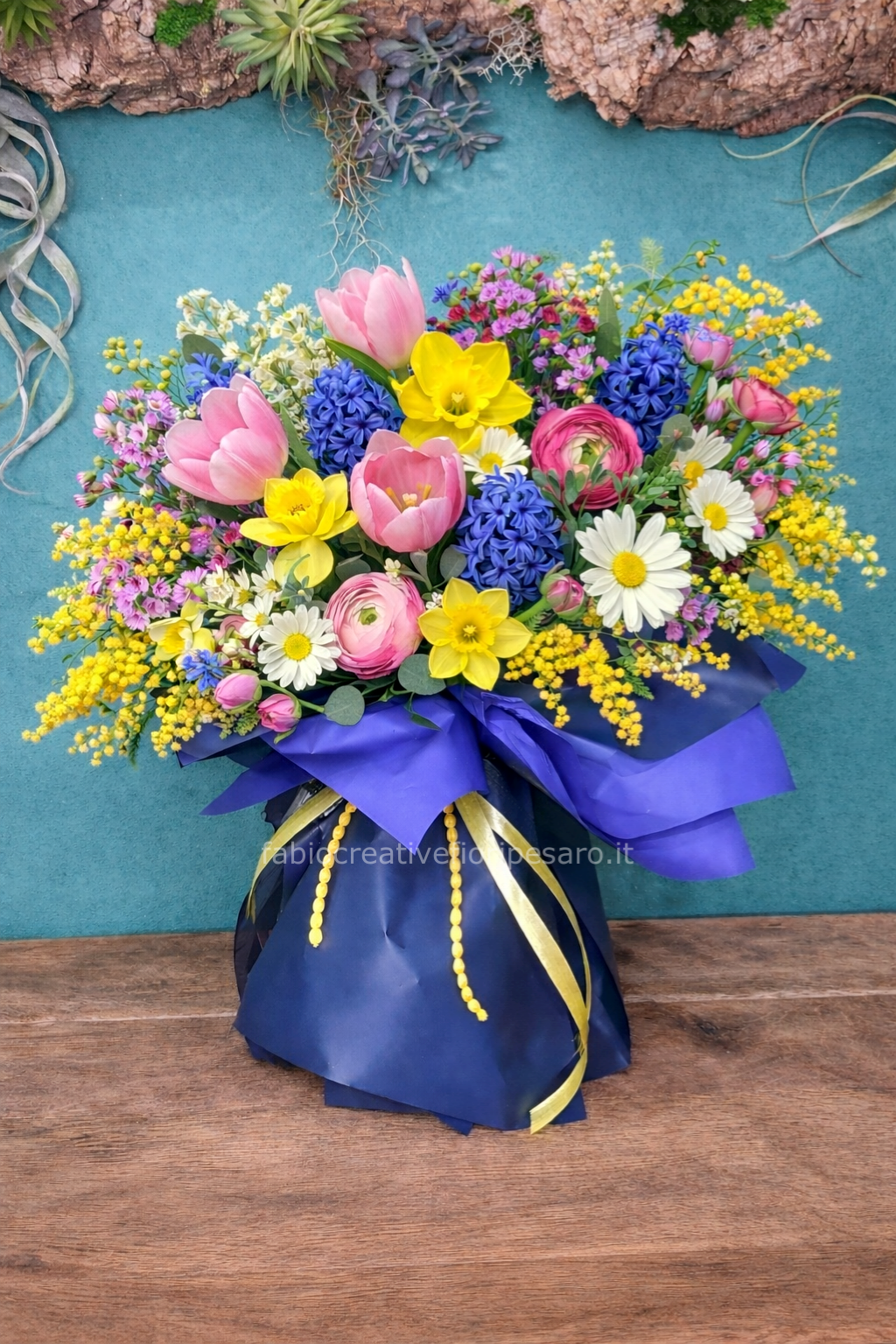 Una composizione fresca e raffinata che unisce la leggerezza della mimosa a un’esplosione di fiori primaverili nei toni del rosa, del blu e del giallo. Tulipani, ranuncoli, giacinti, margherite e narcisi si intrecciano in un bouquet vivace e armonioso, simbolo di rinascita, femminilità ed eleganza spontanea.