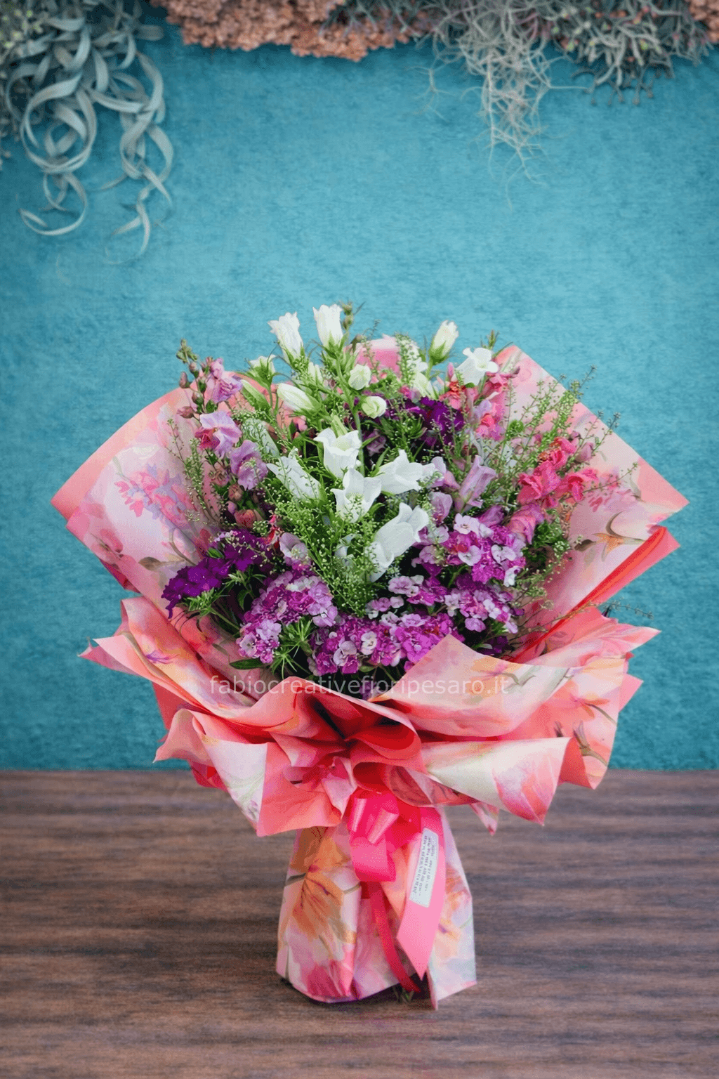 Fiori freschi, profumati e di stagione vengono composti con cura e avvolti in carta floreale per un effetto scenografico e raffinato.