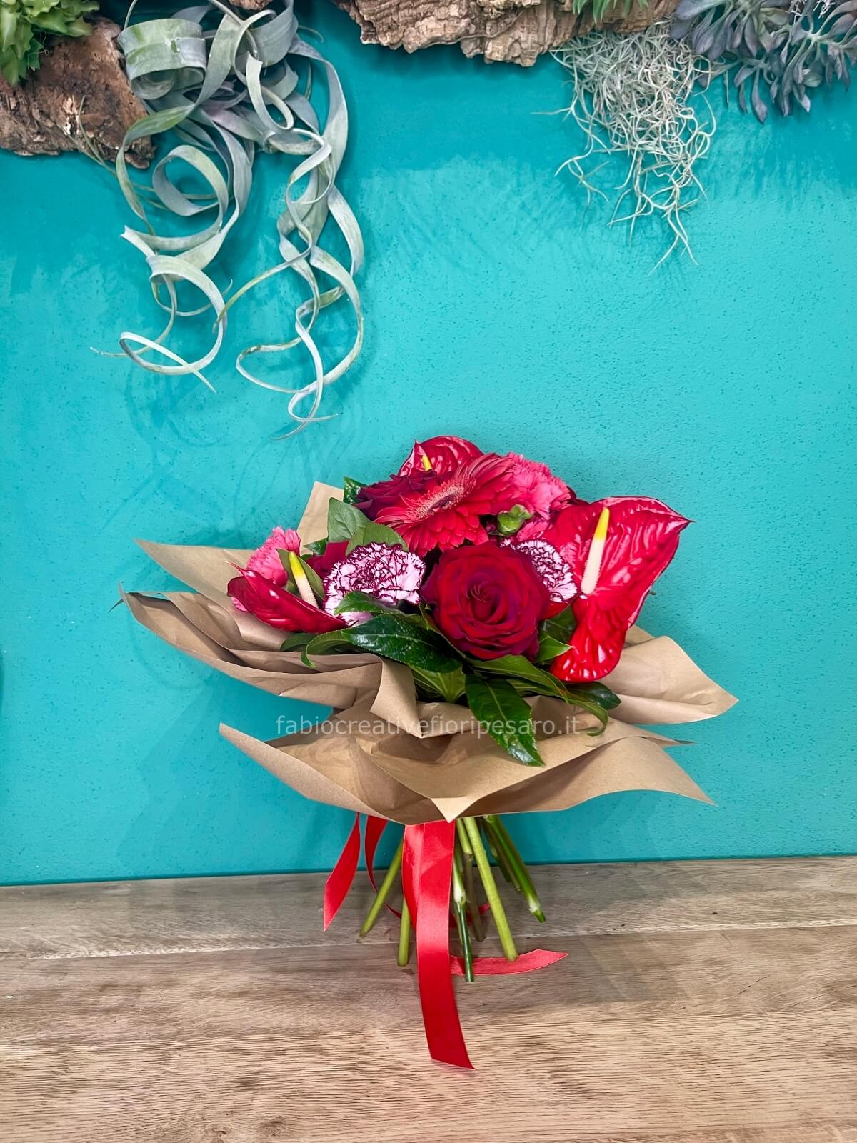 Un bouquet ricco e armonioso, dove il rosso intenso di rose, anthurium e gerbere si unisce alle sfumature delicate dei garofani, creando una composizione romantica e sofisticata. Il verde lucido delle foglie dona equilibrio e profondità, esaltando la bellezza dei fiori.