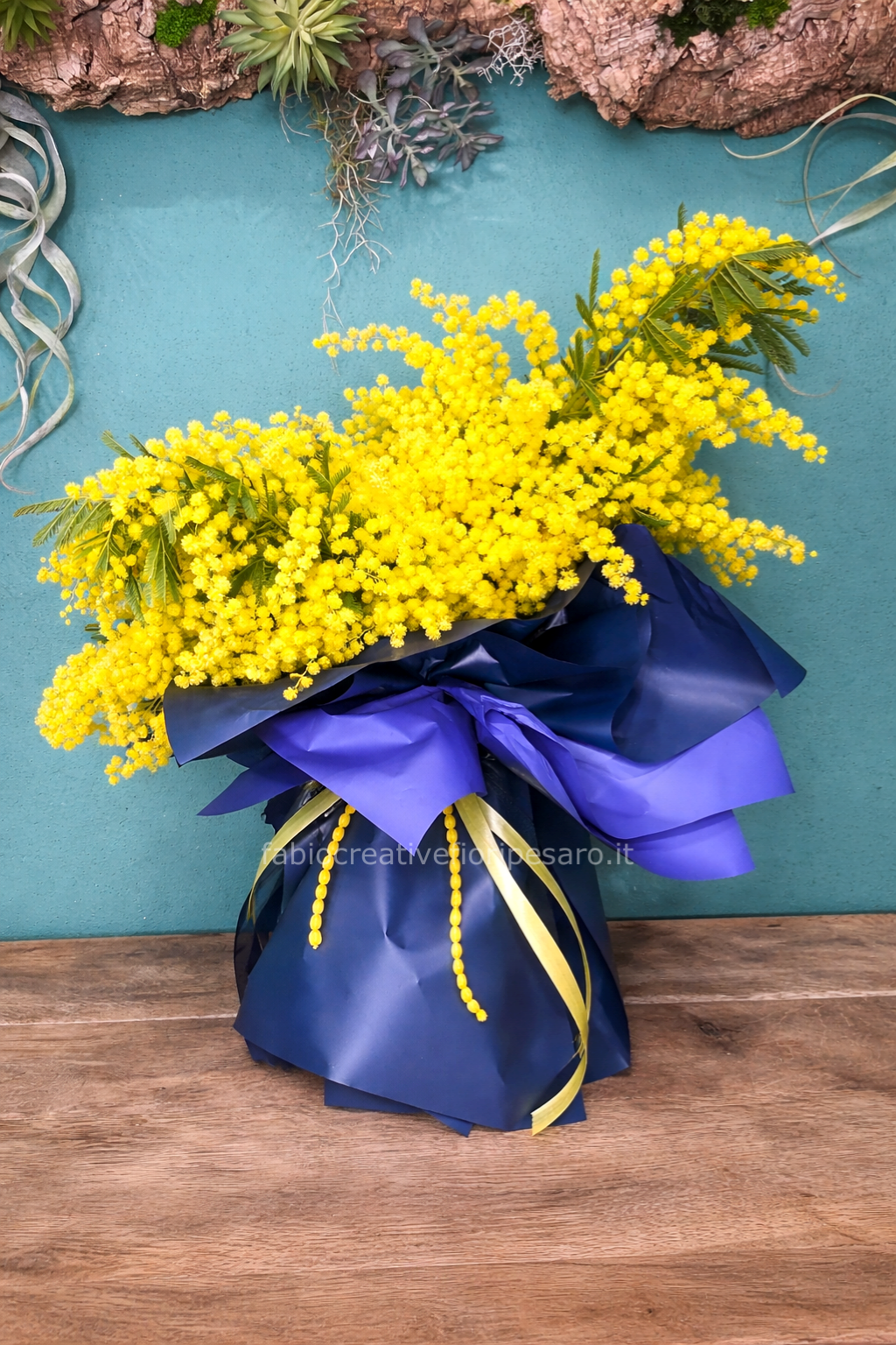 Le sfumature blu-viola dell’incarto incorniciano la mimosa, mettendo in risalto il suo giallo solare e vibrante. Un equilibrio cromatico studiato per celebrare con stile il fiore protagonista dell’8 marzo.