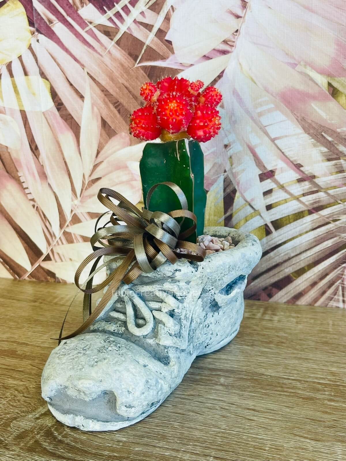 Una composizione fuori dagli schemi che unisce il fascino esotico del cactus innestato (con la sua vivace testa rossa) al design rustico e originale di una scarpetta in pietra decorativa.
