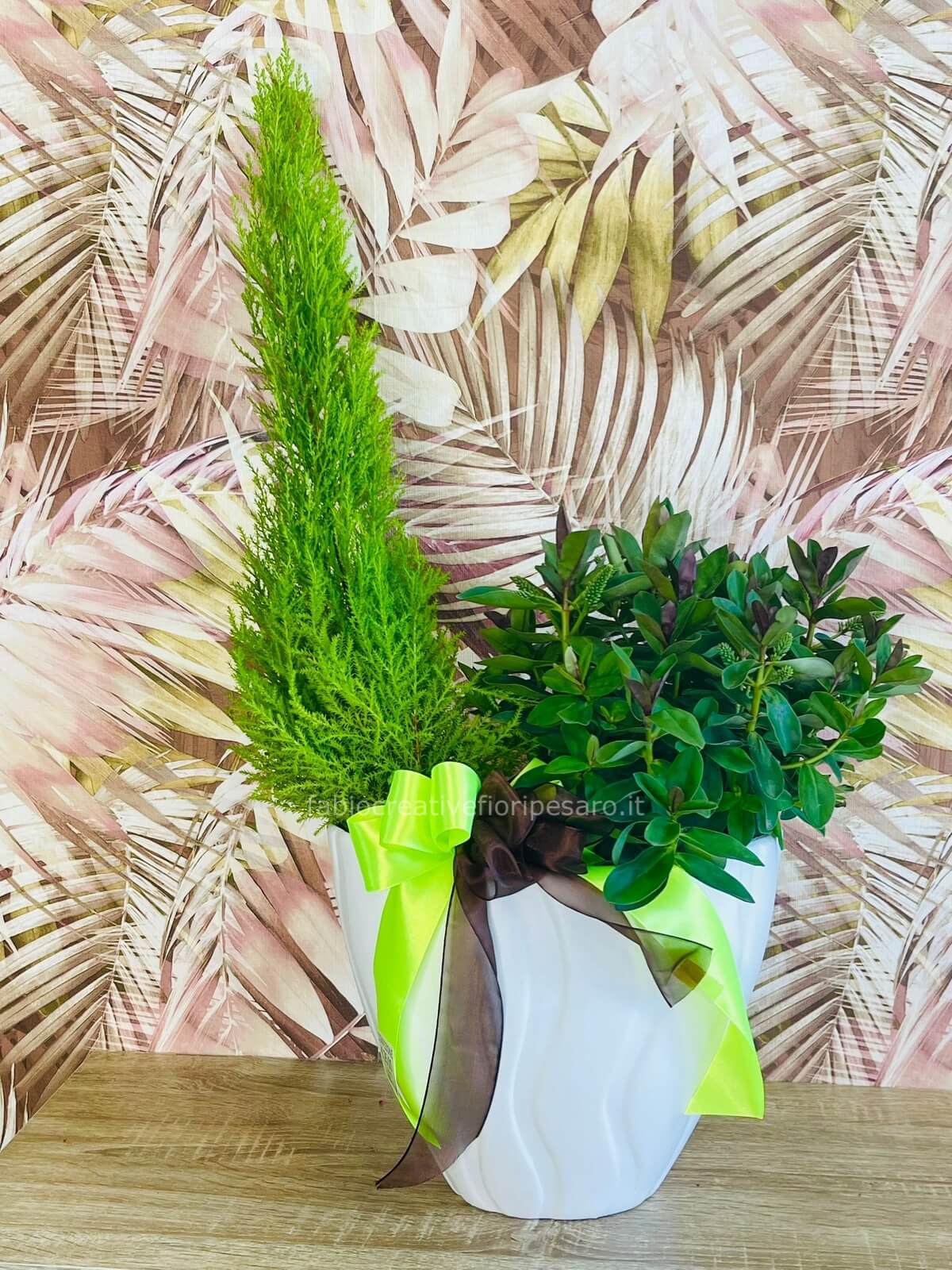 Il tutto è valorizzato da un vaso in ceramica decorativa, perfetto per dare un tocco green e profumato a ingressi, balconi o ambienti interni luminosi.