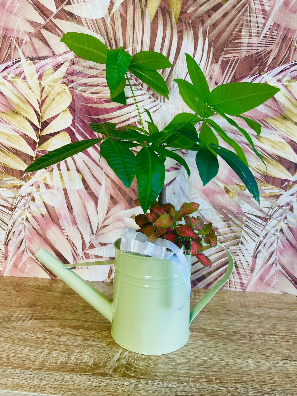 Composizione tropicale in annaffiatoio verde pastello – Freschezza creativa 🌿💧