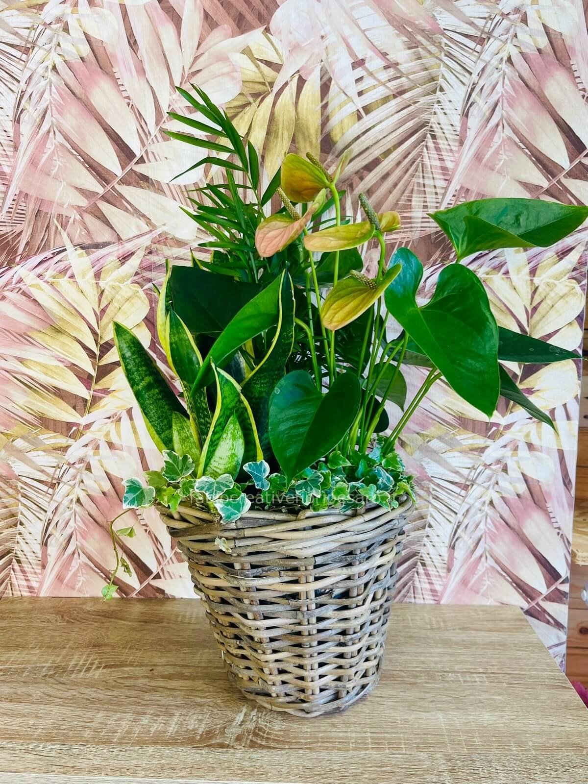 Un mix armonioso di piante da interno sempreverdi e fiorite, racchiuse in un elegante cestino in vimini intrecciato, perfetto per donare un tocco di verde raffinato a qualsiasi ambiente.