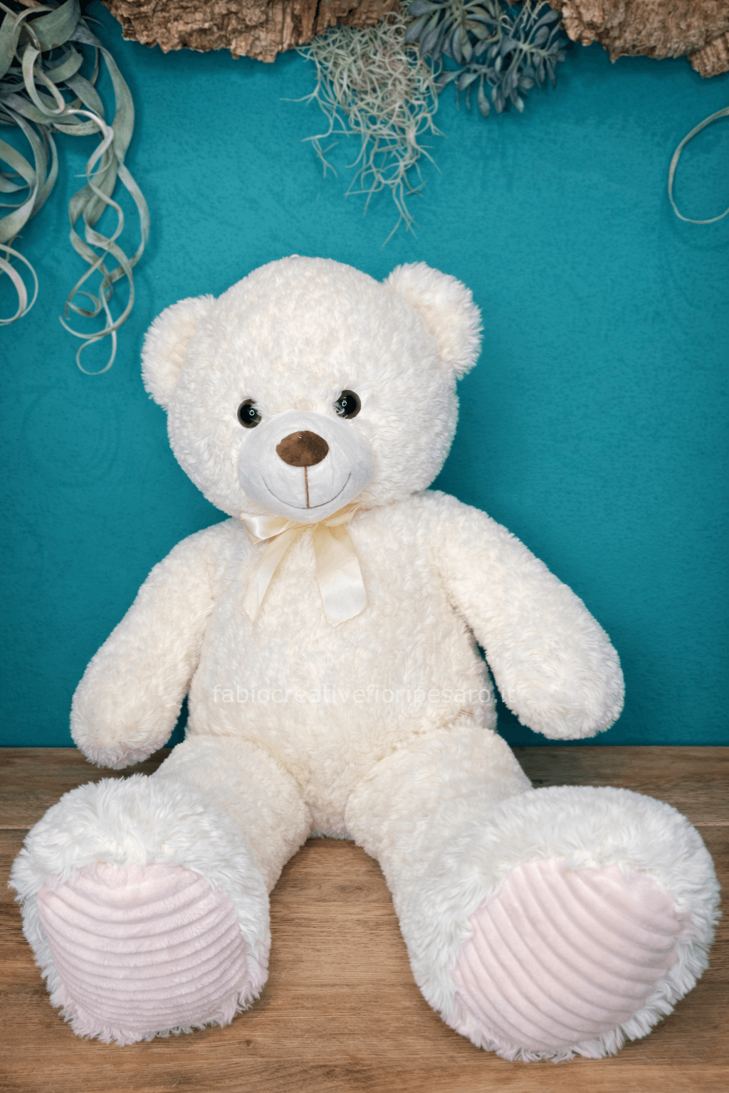 Un tenerissimo orsetto di peluche color avorio, simbolo di purezza, tenerezza e affetto senza tempo. Le sue forme morbide e il suo sguardo delicato lo rendono un compagno ideale per trasmettere emozioni sincere e rassicuranti.