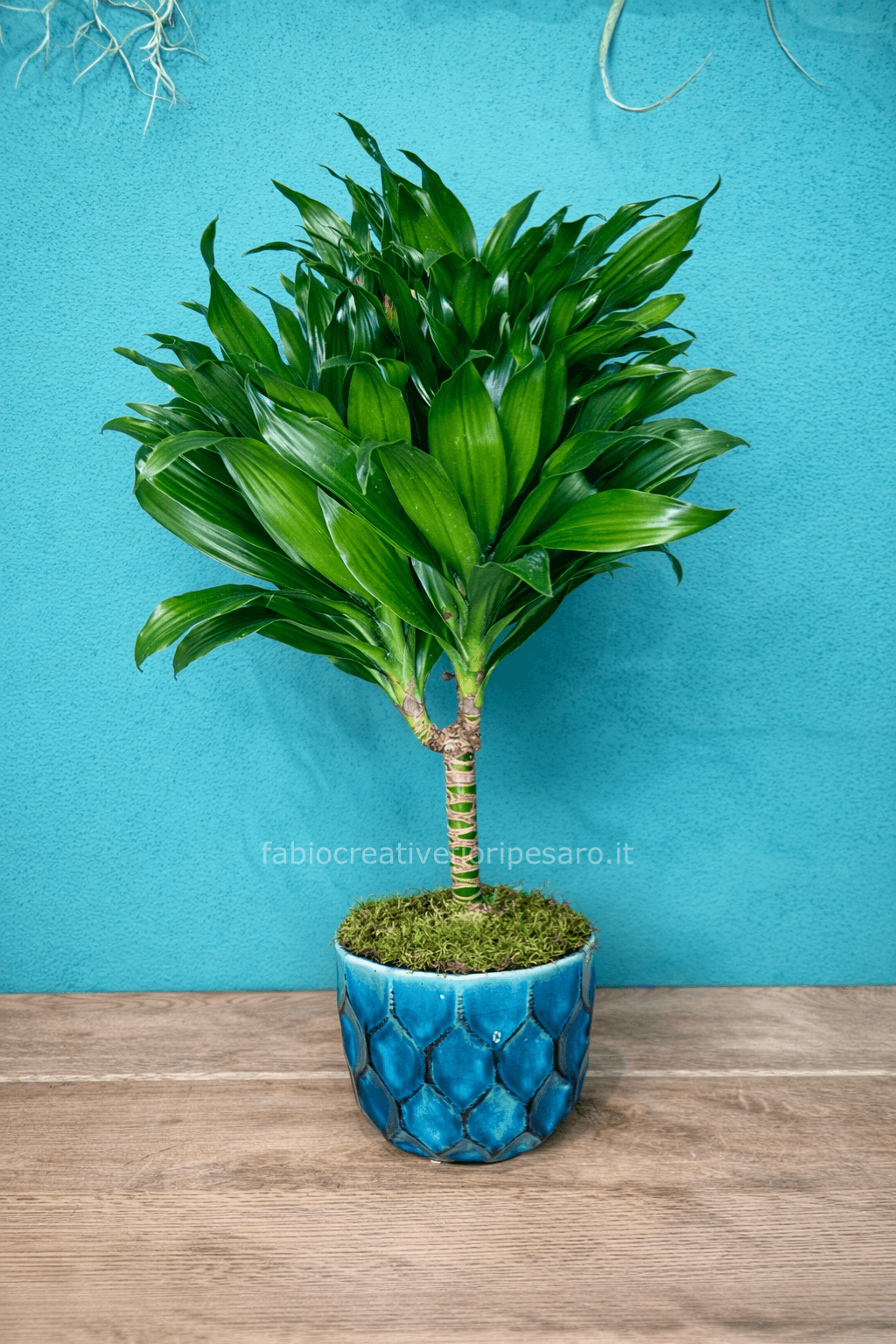 🪴 È valorizzata da un vaso in ceramica smaltata color azzurro petrolio, con texture decorativa e finitura brillante, completato da muschio naturale che esalta l’aspetto curato e naturale della composizione.