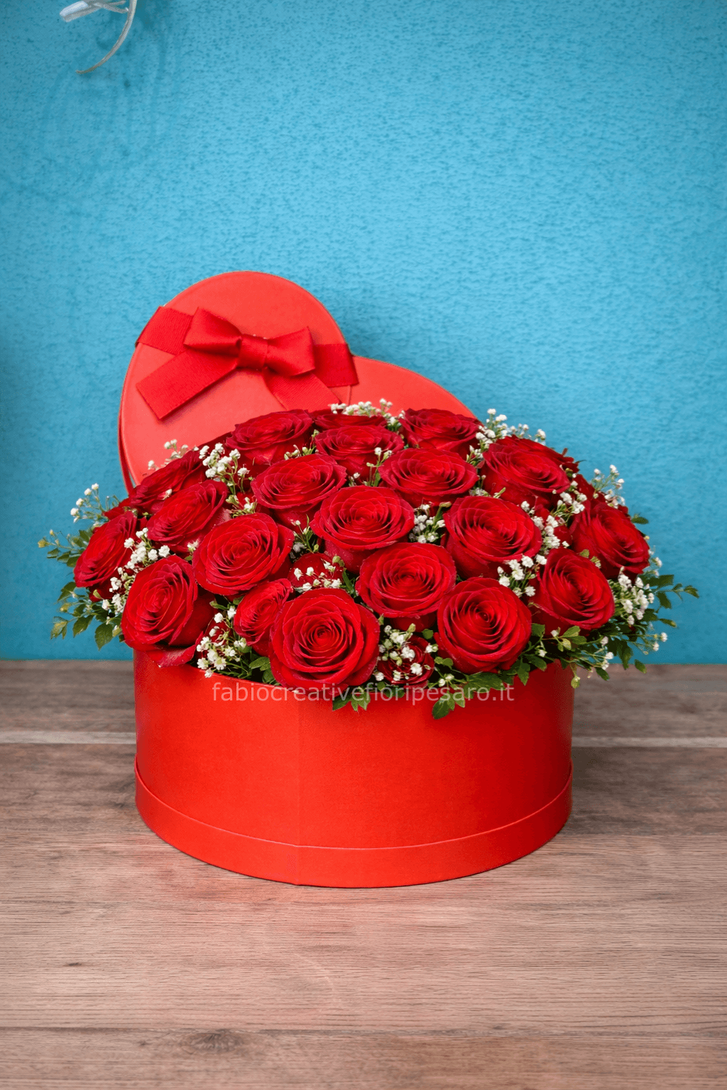La flower box a forma di cuore, raffinata e coordinata nei toni del rosso, valorizza la composizione rendendola un regalo d’impatto, curato nei minimi dettagli.