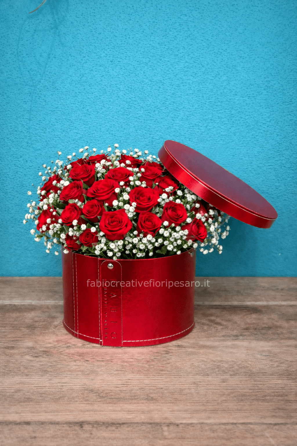 La flower box cilindrica rossa, elegante e coordinata, con coperchio laterale socchiuso, valorizza la composizione e la rende un regalo di grande impatto visivo, ideale per le occasioni più speciali.