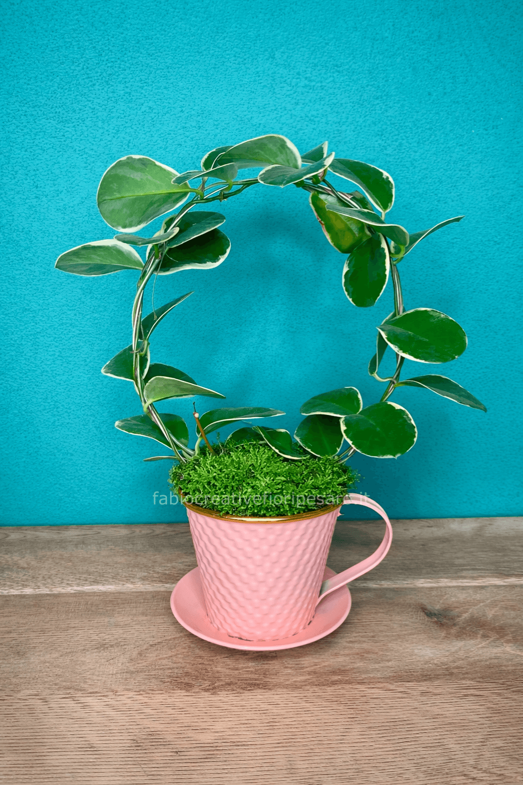 🪴 La Hoya è inserita in una tazza decorativa color rosa tenue con piattino coordinato, perfetta per aggiungere un tocco chic e originale agli ambienti.