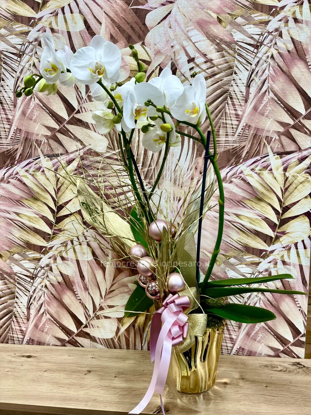 Orchidea Phalaenopsis bianca decorata – Raffinatezza luminosa in versione festiva ✨🤍