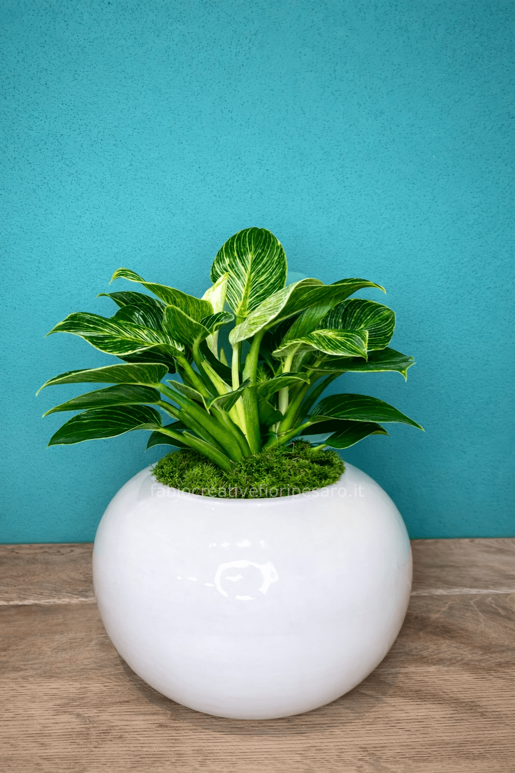 🪴 È proposto in un vaso tondo in ceramica bianca lucida, dalle linee morbide e contemporanee, che valorizza il contrasto cromatico delle foglie e dona un tocco di luce all’ambiente.