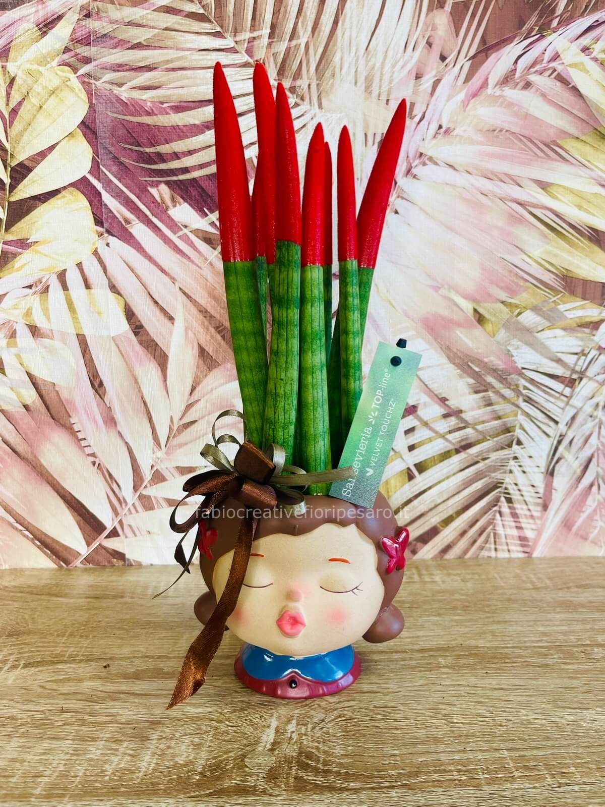 Una pianta trendy e resistentissima: la Sansevieria cylindrica con punte in velluto rosso è proposta in un vaso a forma di bambolina dai toni allegri e dal design giocoso.